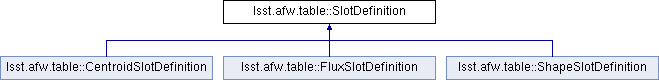 Each type of slot corresponds to a subclass of SlotDefinition, and each actual slot corresponds to a particular field name prefix. For instance, to look up the centroid slot, we look for fields named "slot_Centroid_x" and "slot_Centroid_y" (or a single compound "slot.Centroid" field in version 0). Instead of actually naming a particular field that, however, we use Schema's alias mechanism (see AliasMap) to make these field name lookups resolve to the name of other fields. The actual definition of the slots is thus managed by the Schema's AliasMap, though a SourceTable object will cache Keys for the various slots to make sure accessing slot values is efficient (more precisely, when you set an alias related to a slot on an AliasMap, any table it corresponds to will receive a notification that it should update its Keys). These cached Keys are actually stored within the SlotDefinition (as data members of derived classes).