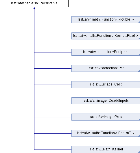 Inheriting from Persistable provides a public API for reading/writing individual objects to FITS that is fully defined in the base class, with derived classes only needing to implement persistence to catalogs. It is expected that objects that contain multiple persistables (such as Exposures) will create their own InputArchives and OutputArchives, and use these to avoid writing the same object twice (which would otherwise be a big concern for future objects like ExposureCatalog and CoaddPsf).