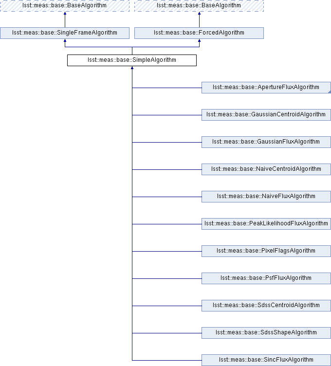 SimpleAlgorithm allows a ForcedAlgorithm to be defined using the measure() and measureN() signatures of SingleFrameAlgorithm. It should be used for any algorithm for whichi the forced version of the algorithm does not require anything to be transformed beyond the centroid and shape, and for which the the parameters being fit are the same for both single-frame and forced measurement. This should be the case for all flux algorithms that don't involve fitting any additional model parameters. It can also be used for centroid and shape algorithms, where having a version that can re-measure values in forced mode may be useful for diagnostic purposes even if it is not useful for science.